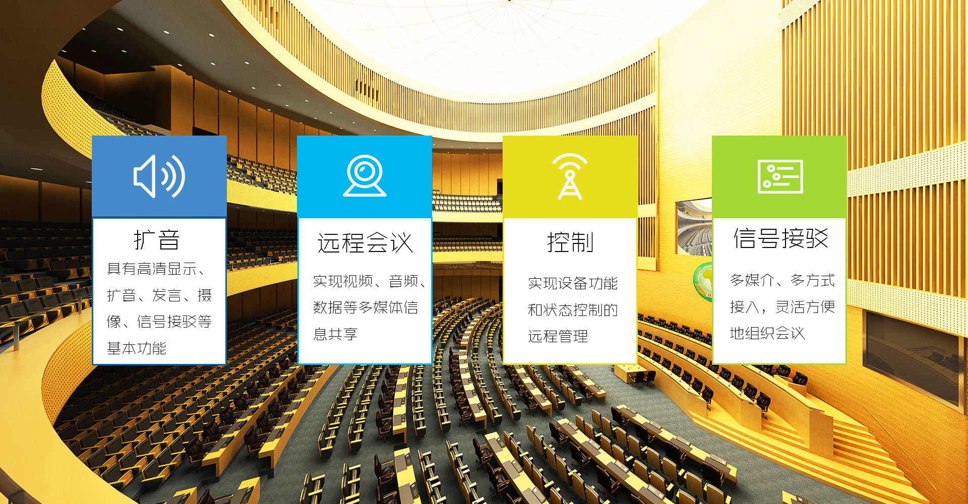 智能化會議系統(tǒng)具有高清顯示、擴音、發(fā)言、攝像、信號接駁等基本功能,同時也應(yīng)具備智能化管理功能;實現(xiàn)視頻、音頻、數(shù)據(jù)等多媒體信息共享;實現(xiàn)設(shè)備控制和狀態(tài)的安全遠程管理;具有會議預(yù)訂、變更、查詢、錄播、權(quán)限設(shè)置等會議管理功能;具有應(yīng)急響應(yīng)功能;可實現(xiàn)在會議中的無縫切換,保障會議平穩(wěn)進行;多媒介,多方式接入,靈活方便地組織會議。